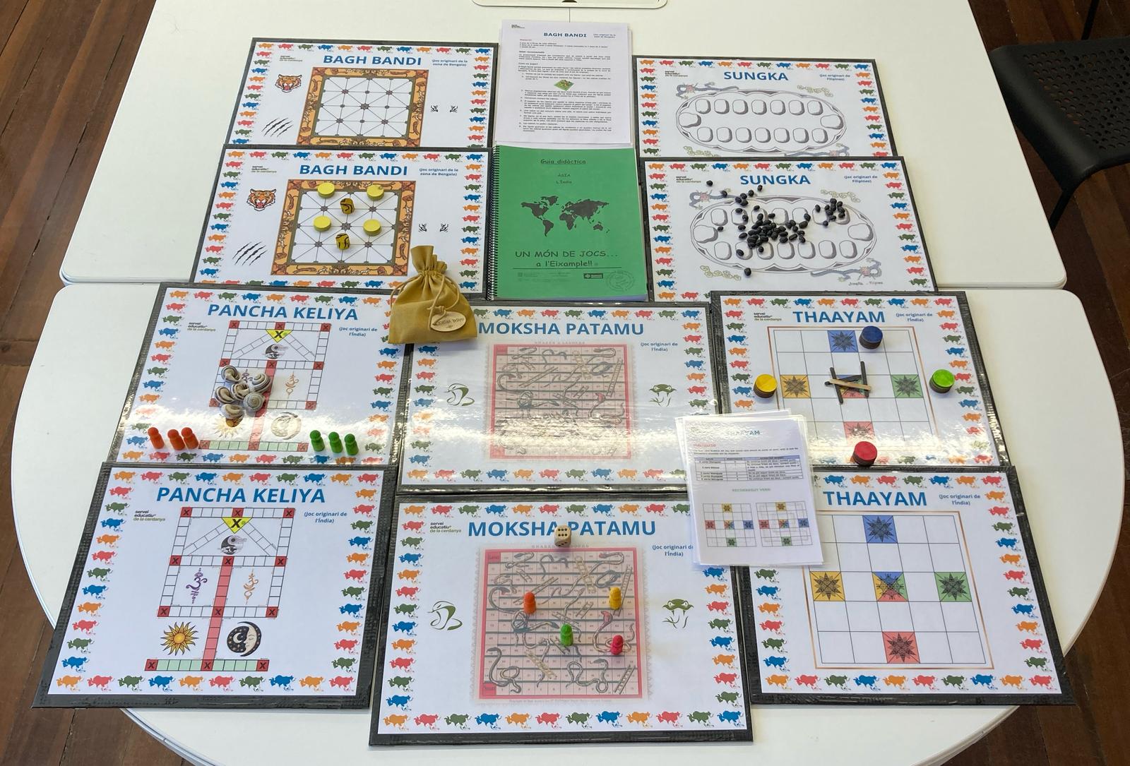 Taulells de jocs, fitxes i normativa dels següents jocs originaris d'Àsia: Moksha Patamu, Thaayam, Bagh Bandi, Sungka i Pancha Keliya.